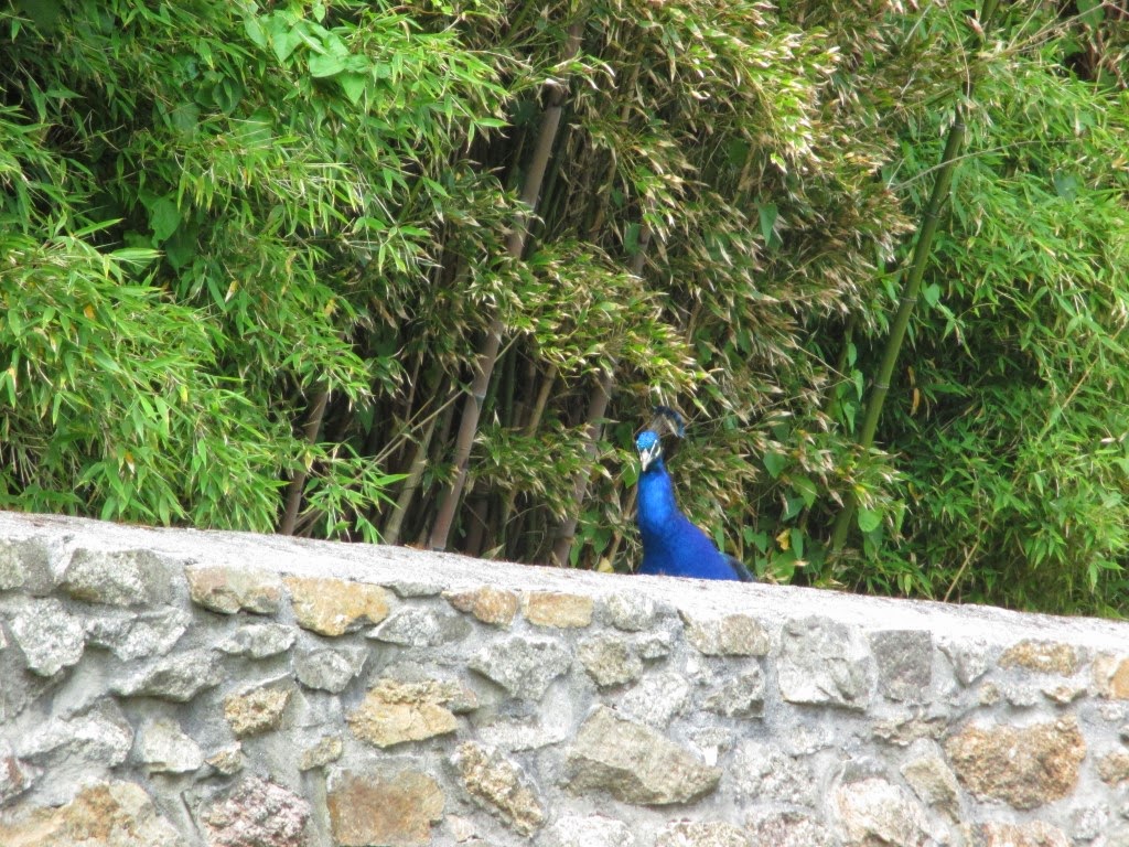 Hver dag hørte vi en Påfugl's kald og pokker om den ikke holdt til i haven hos bag-naboen. Her stikker den hovedet op over muren: