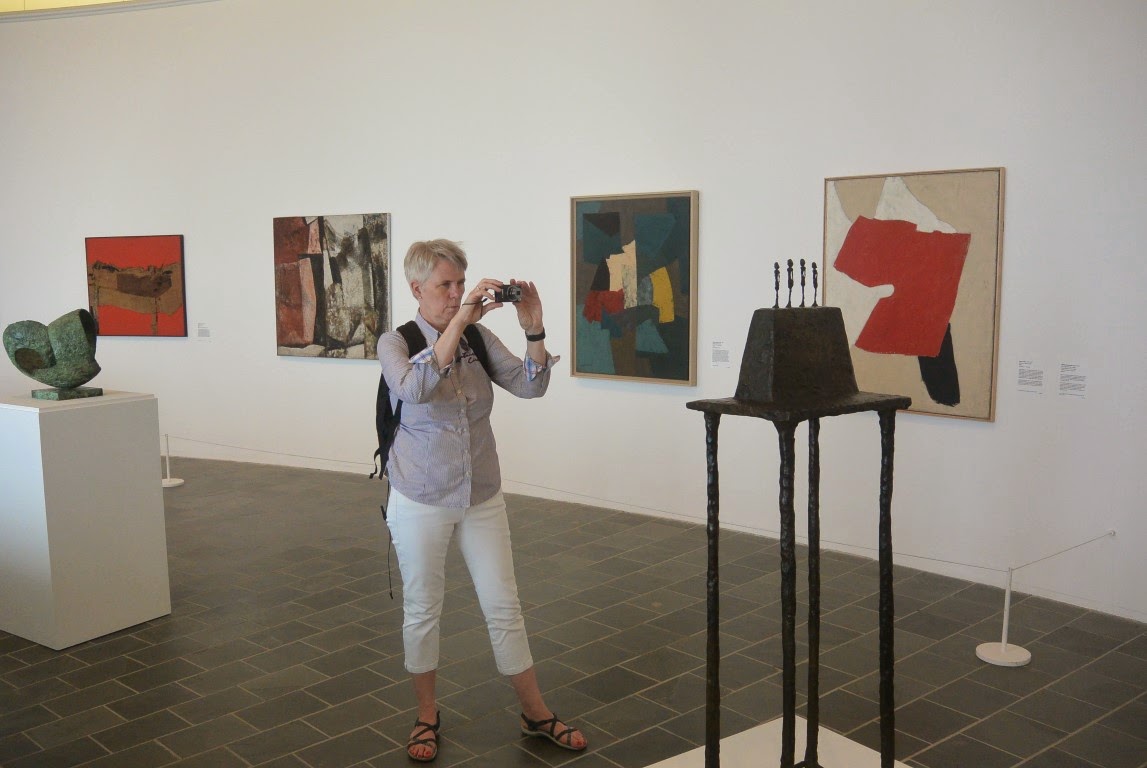 Det var dog hele entreen og udflugten værd. Masser af gode engelske kunstnere fra 1900 og fremad i blandet også lidt udenlandske. Herunder ses Lillemor fotografere en Giacometti skulptur. Hun er helt pjattet med Giacometti's lange tynde figurer. Brøkdelen af et sekund efter de her 2 billeder (mit og Lillemors) blev taget fik vi at vide af en museumsvagt at fotografering ikke var tilladt. Vi havde ved ankomst læst brochure og checket for skilte men ingen fundet om fotografering forbudt. Sådan var det bare.