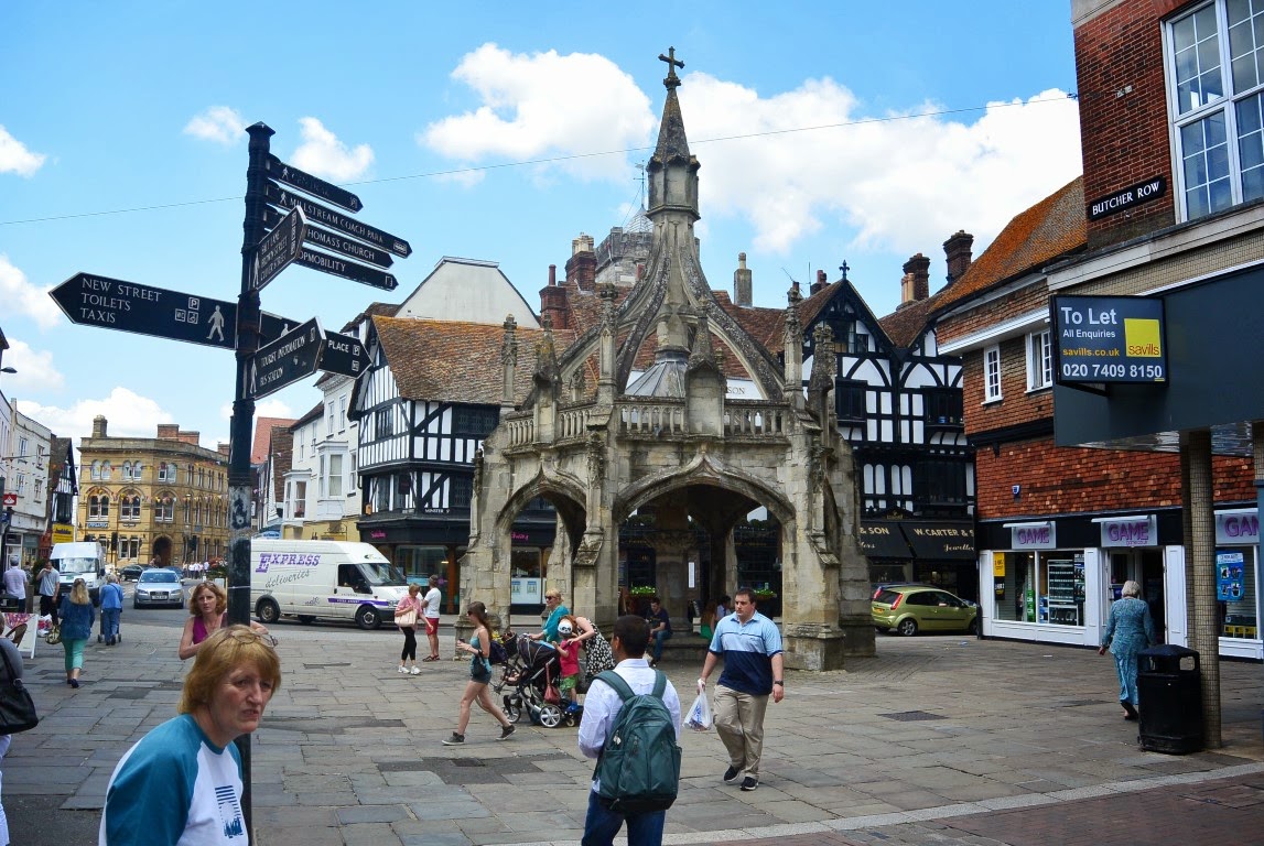 Efter besøget ved Stonehenge kørte vi mod den gamle by Salisbury. I gamle dage - i middelalderen - kaldtes den for "Old Sarum". Måske navnet virker bekendt, for det er den by (i bogen kaldet Kingsbridge) og dens Katedral som forfatteren Ken Follet skriver om i si bog Jordens Søjler som også er blevet filmatiseret og vist som serie i TV. Herunder ses Salisbury's gamle Markedsplads. Bemærk bindingsværkhuset i baggrunden, som er en af byens ældste huse og offentlige udskænkningsteder og hvor man allerede i 1650'erne serverede morgenmad og aftensmad, men af en eller anden besynderlig grund nævntes intet om frokost.