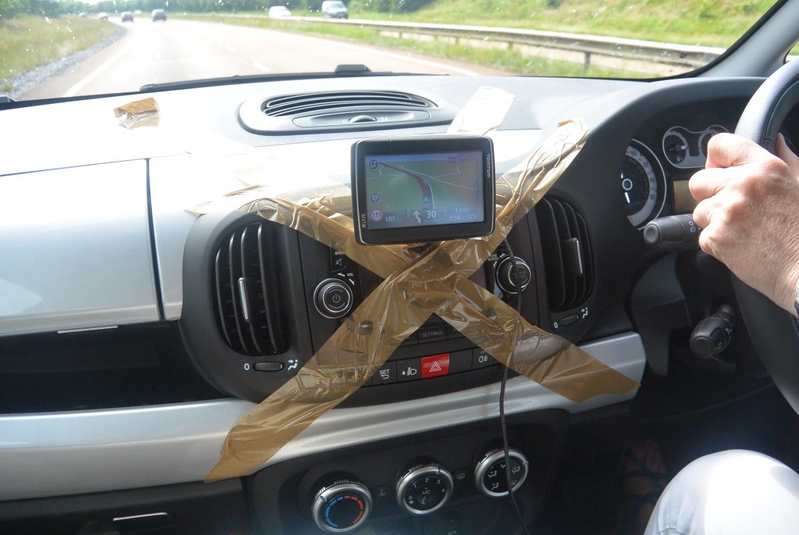 Næste dag var det afgang og mod Gatwick. Herunder ses vores improviserede GPS-holder. Den normale ville sidde fast uanset hvad vi gjorde, så vi købte en tape-rulle og klistrede den fast til bil-radioen.