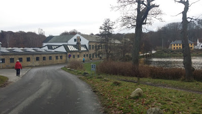Når man kommer ned fra P-pladsen, kan man vælge at gå direkte ind i Dyrehaven via en af de røde Porte. Vi fortsætter som altid hen til Knivfabrikken, for at gå ind gennem porten der. Nedenfor ses hele anlægget. Rådvad Knivfabrik er jo fra  1758, så det er et gammelt industrianlæg der ligger der. På billedet nedfor ses - udover Lillemor i sin røde jakke - fabrikken med søen til venstre. Anlægget blev jo dengang drevet ved hjælp af vandmøller (bl.a. deraf navnet Mølleåen) og der er 2 Møllevandløb der.