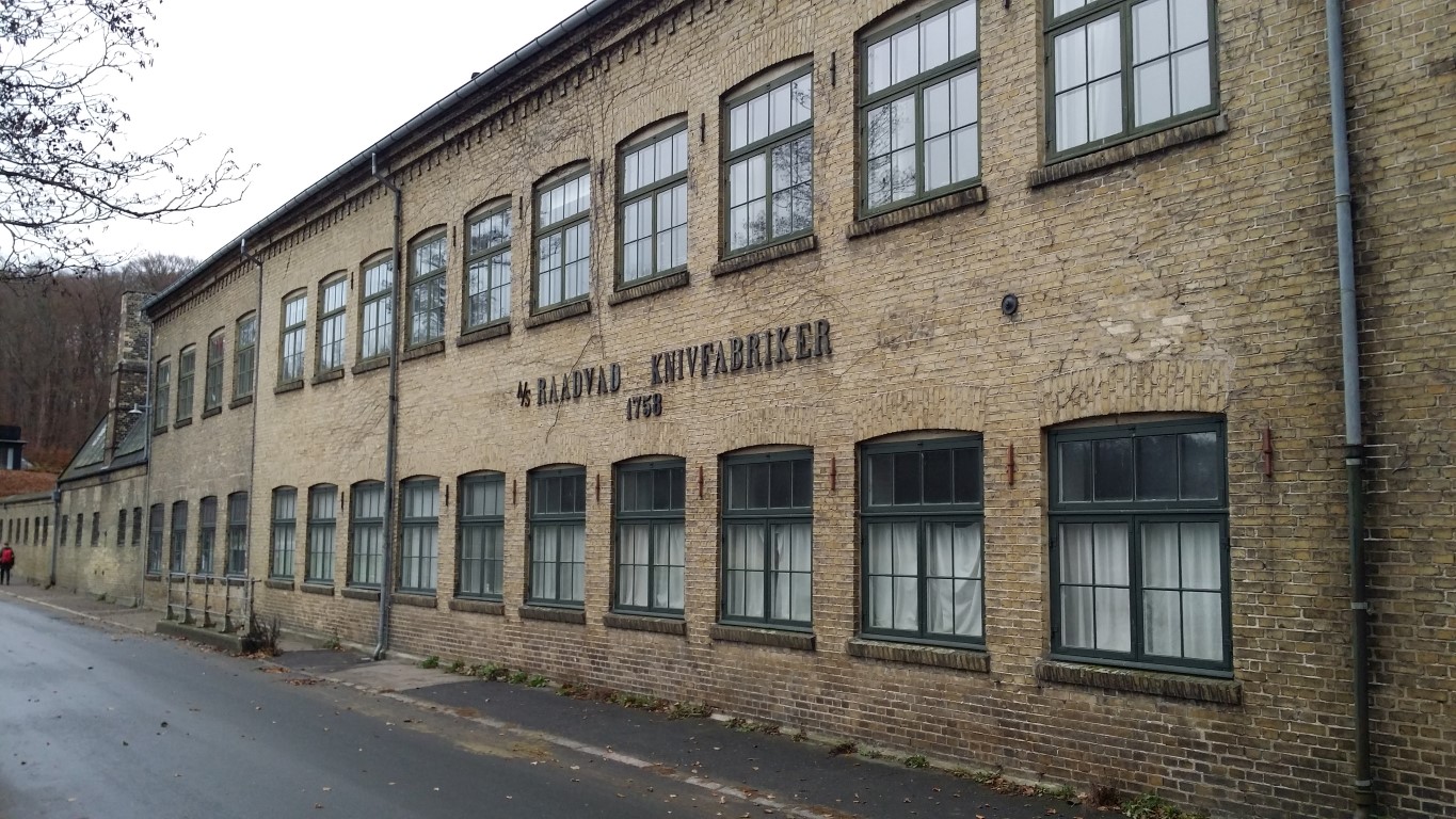 Her ses Hovedbygningen af den gamle knivfabrik. I dag er der bronze-støber-værksted i denne bygning.