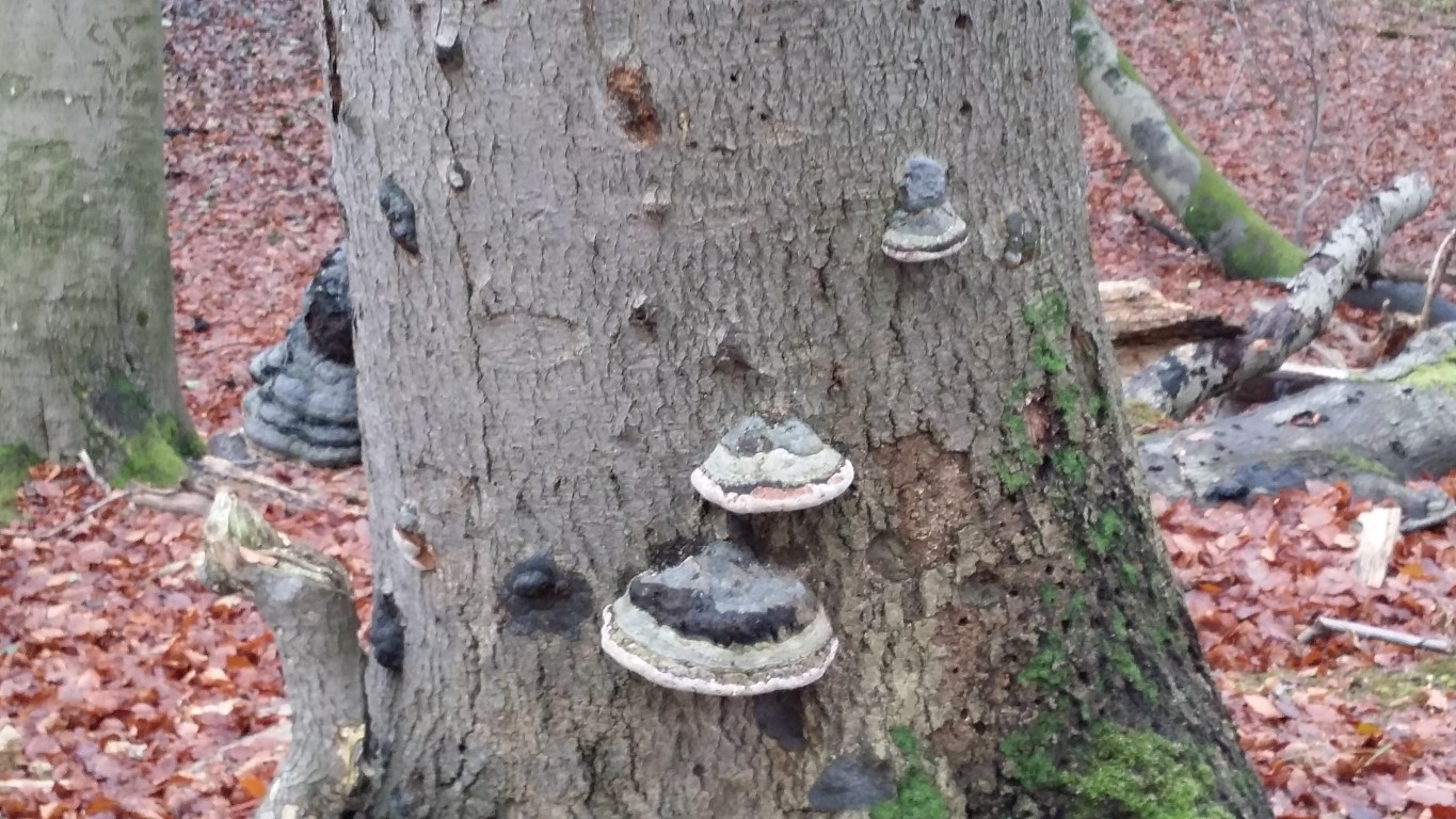 På mange af de døde og stadigt stående træer - det er nærmest kun stammerne der er tilbage har jeg bemærket - er der masser af de her flade svampe ligesom de også har masser af spor efter Spætternes hakken.