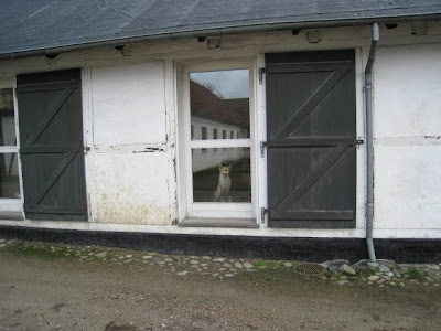 Ved Naturskolen stod Mikkel Ræv - udstoppet ganske vist - og kiggede ud af glasdøren. I døren der skimtes til venstre stod en Hare....