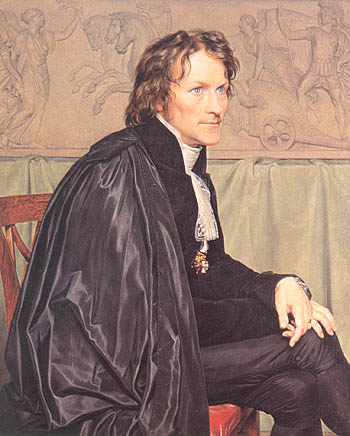 ...og bevares da, der er da farver på ægteparret her og det er der så sandelig også på de fleste af Eckersberg's malerier, men lige da hun havde sagt det, så kom jeg til at tænke på 2 malerier, som Eckersberg har lavet og hvori han behandler farven SORT på en utrolig måde. Det første forestiller billehuggeren Bertel Thorvaldsen i hans ordensdragt fra San Luca Akademiet i Rom og som Eckersberg malede af Thorvaldsen under Eckersbergs ophold i Rom: