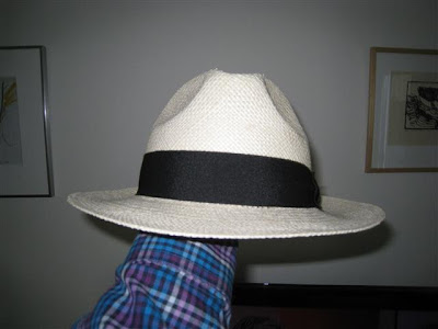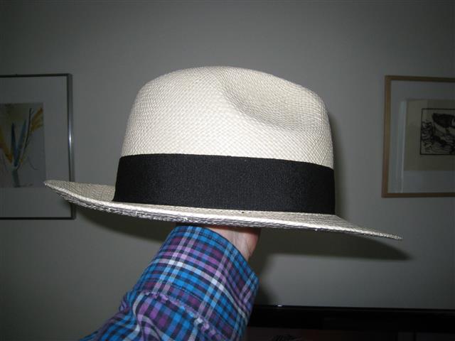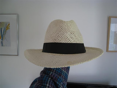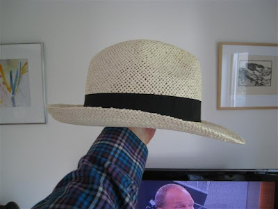 Den næste i rækken er også en sommer-hat som har tjent mig godt de seneste par somre. Den erhvervede jeg for ca. kr. 100 og det ved en souvenir-biks tæt på Peters Kirken i Rom. Det specielle ved denne hat er, at den er lavet af........papirs-tråde der er flettet. Den kan IKKE tåle vand overhovedet og er nu ved at tabe form og farve...den er ved at gulne især omkring båndet. Den er uhyre blød og let og er et par gange lettet fra hovedet :-) . Størrelsen indeni sige 61 (!?).