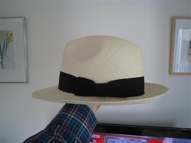 Den næste købte jeg også, før den ovenstående da det var ca. 100 grader varmt i Wien da vi ankom, hos Hattefirmaet Nagy-Hüte. Det er en ægte Panama-hat vævet (tæt vævet) af ægte strå i Equador. Hattestørrelsen er her 58. Prisen var ca. kr. 640. Den er dejlig luftig og med pæn skygge som hjælper.