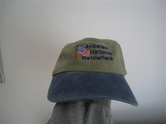Den næste erhvervede jeg på "Antietam National Battlefield" også under besøget derovre i 2012. Den hat har jeg på oppe på "Header-billedet" hvor jeg netop står på denne, Antietam, slagmark i Maryland. Jeg har også en hel dybblå mørk en med teksten Sharpsburg 17. September 1862 på og så både Nordstatsflaget og Sydstatsflaget krydset ovenover teksten. Den anvendes sjældent. Antietam var slagmarken og lå ved byen Sharpsburg. Nordstaterne bruger navnet "Antietam" og sydstaterne navnet "Sharpsburg" for det samme slag.